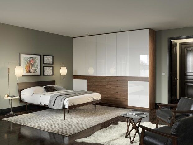 All Pro Fixes Closets designed a stunning bedroom wardrobe with sleek back painted glass doors that reach from floor to ceiling.