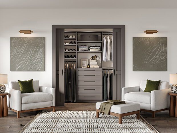 All Pro Fixes Closets offers a sleek and functional dark grey reach-in closet design complete with shelving, rods, and drawers for optimal organization.